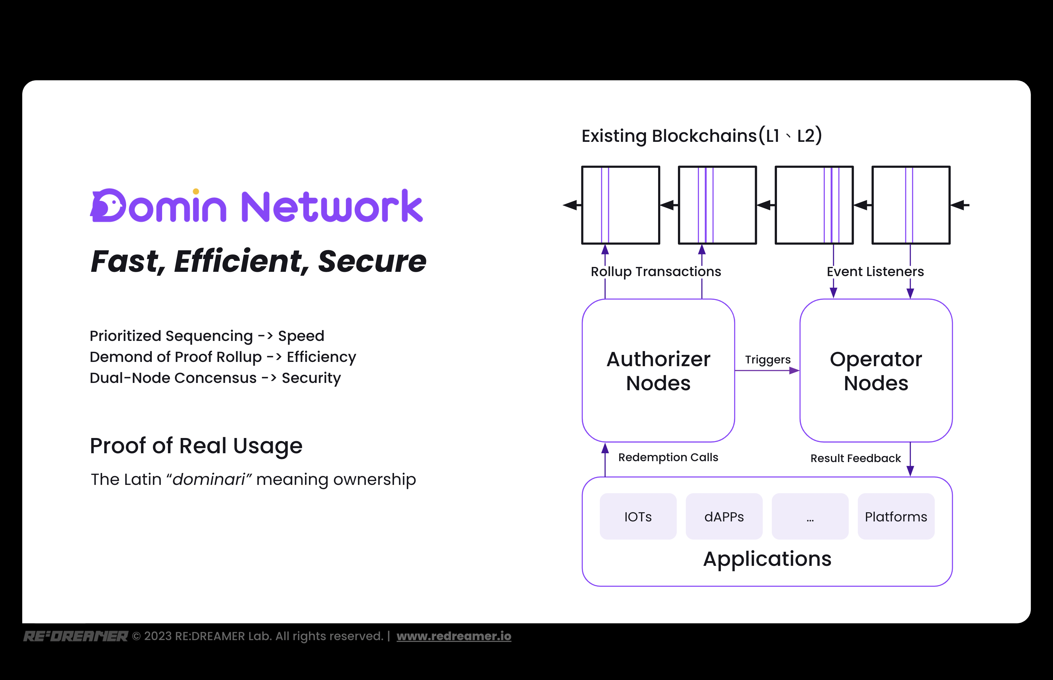 Domin Network is designed to be a business oriented data processing network for consumer data. Structured on the basis of verifiable and evolving consumer authorization proofs (CAPs), it aims to govern the behavior of data in a dual-node structure before rolling the data onto blockchains.